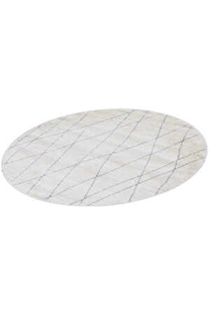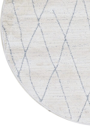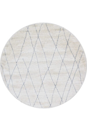 שטיח עגול לבן מקולקציית מאטיס החדשה, בעיצוב מרוקאי המאופיין במעויינים עדינים בגוון אפור עדין.